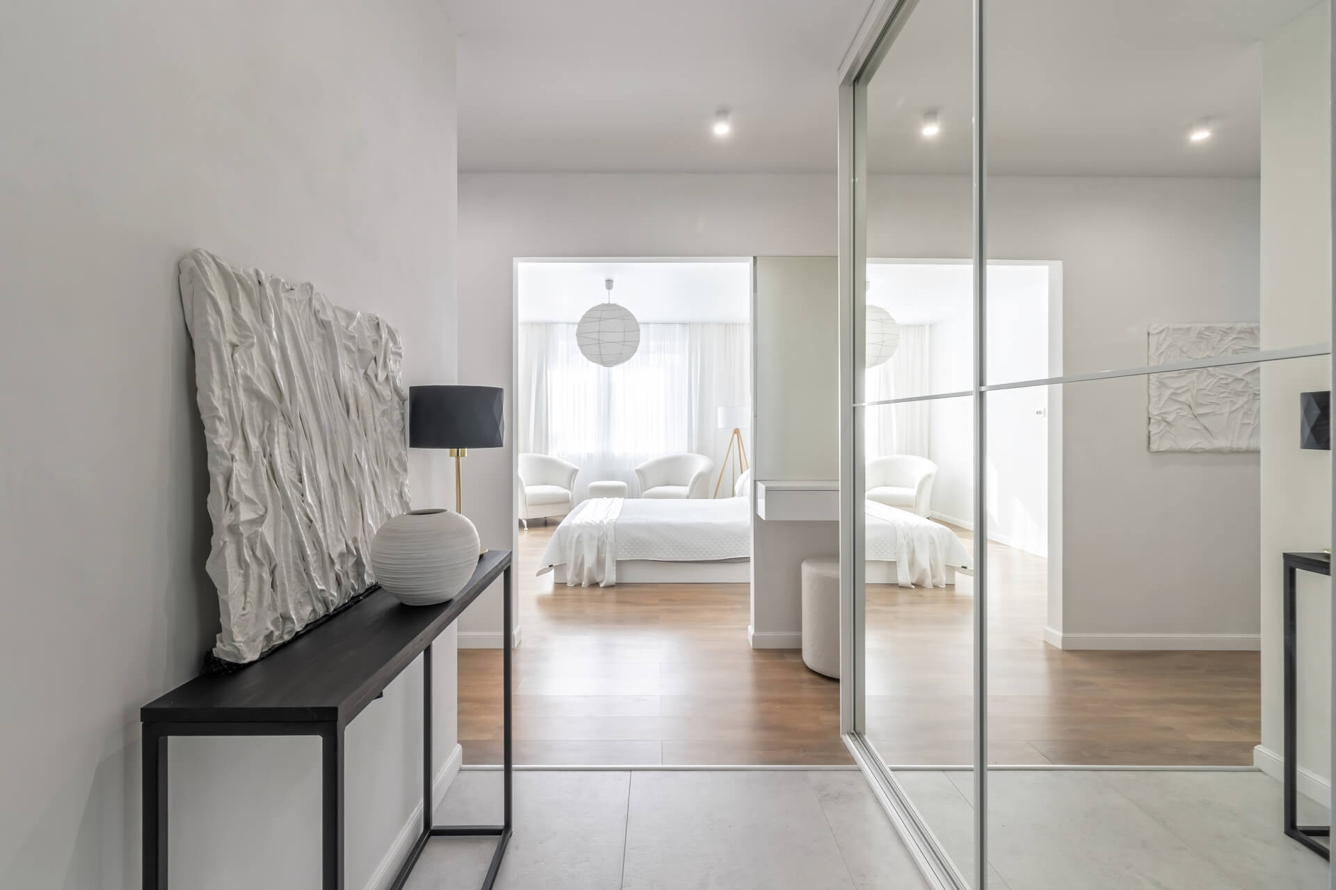 Lustra to doskonały sposób na wizualne powiększenie pomieszczenia. Umieszczając duże lustro na ścianie, odbijamy światło i otoczenie, co tworzy wrażenie głębi. Świetnym rozwiązaniem, które często stosuję w aranżacjach mieszkań w bloku, są fronty szaf z lustrem, co dodatkowo zwiększa efekt przestronności bez zajmowania dodatkowego miejsca.