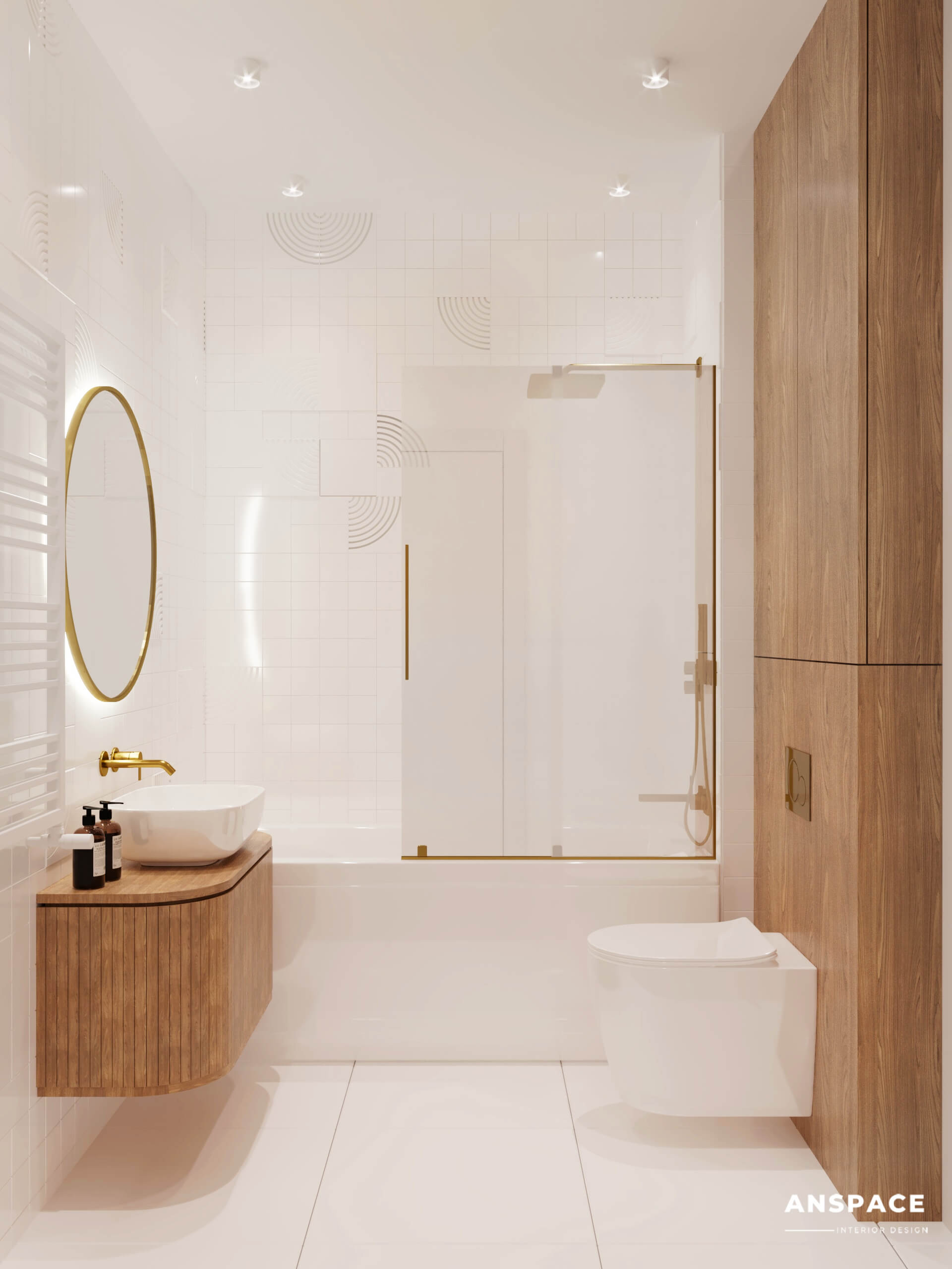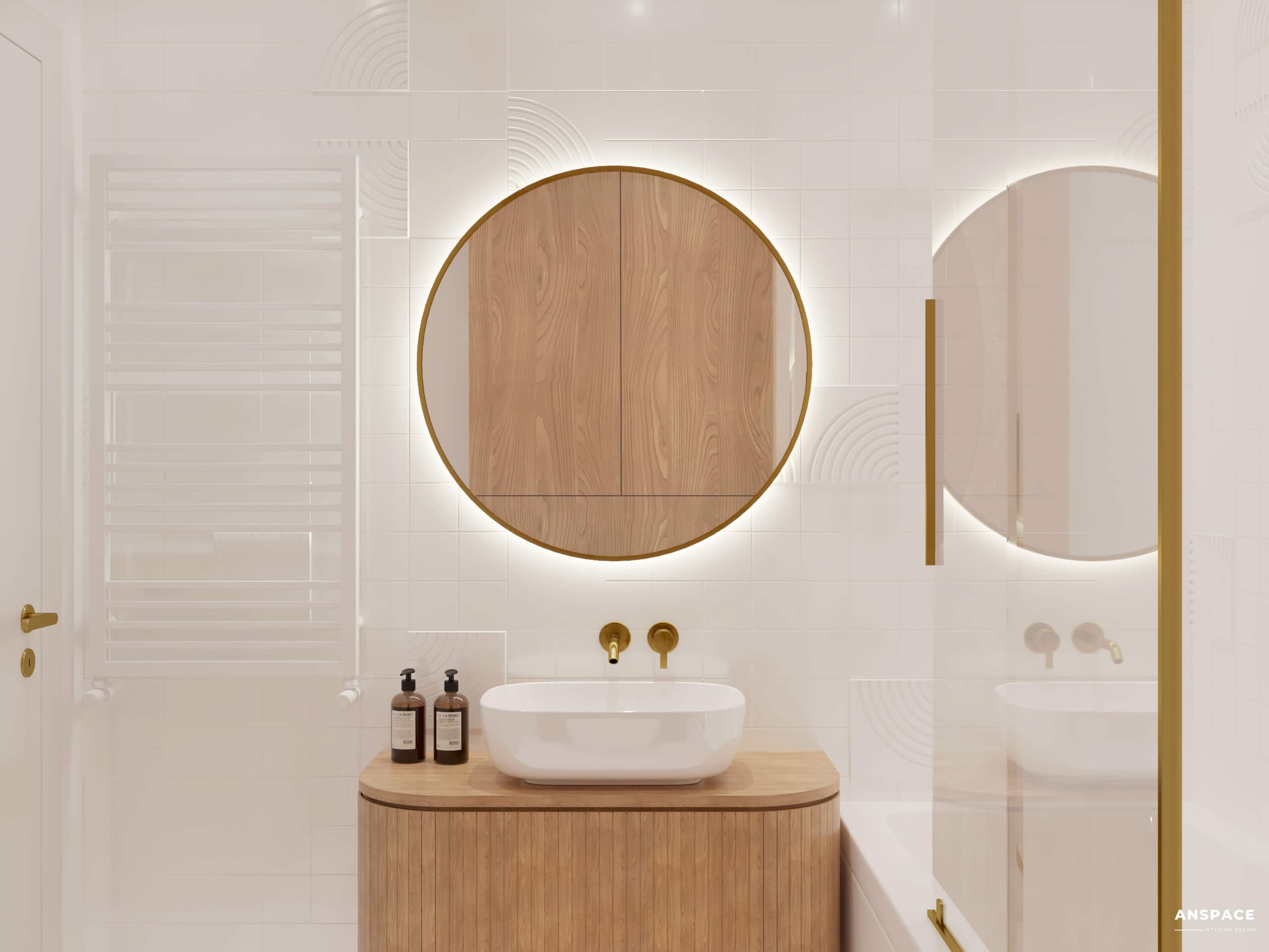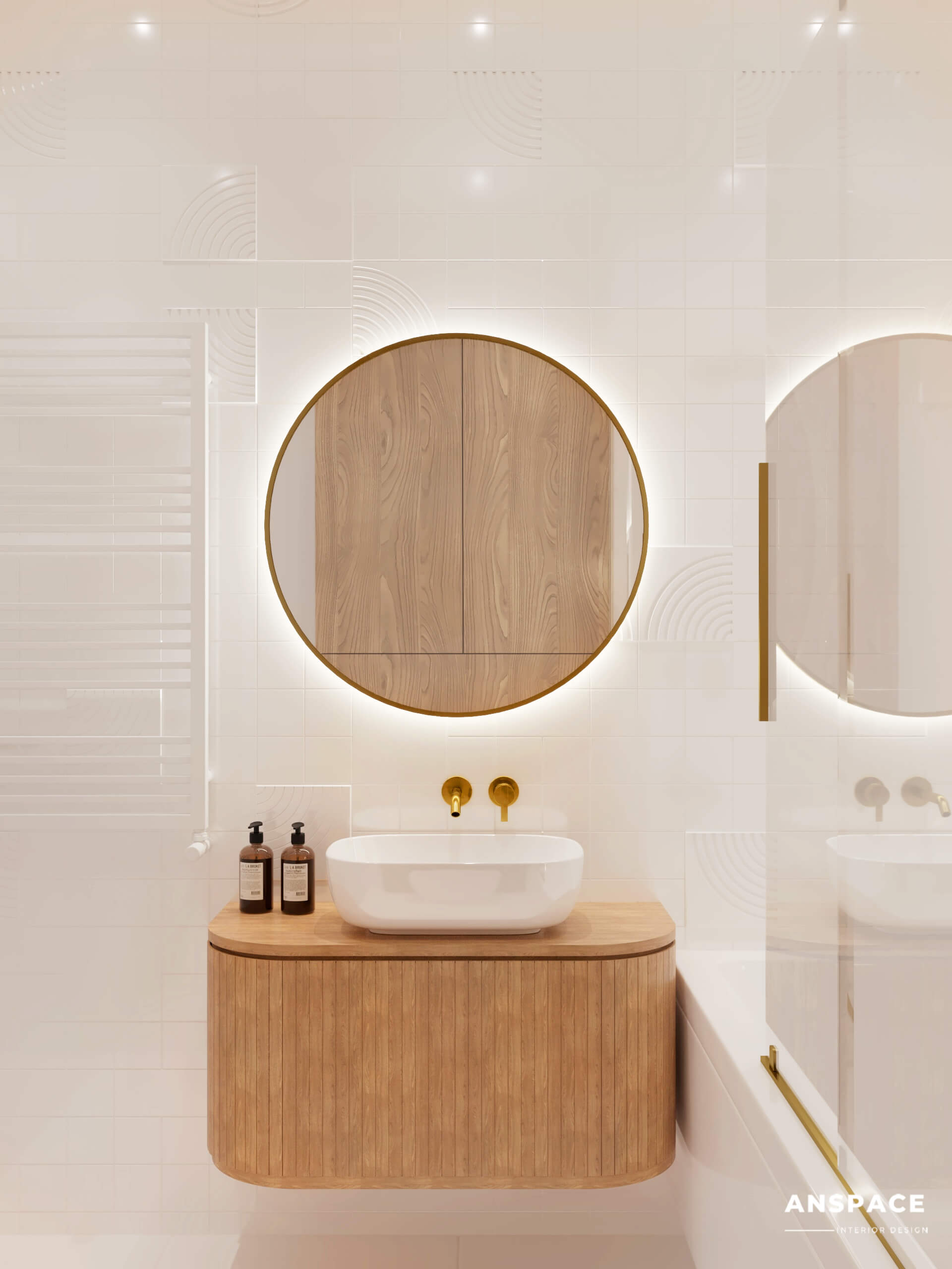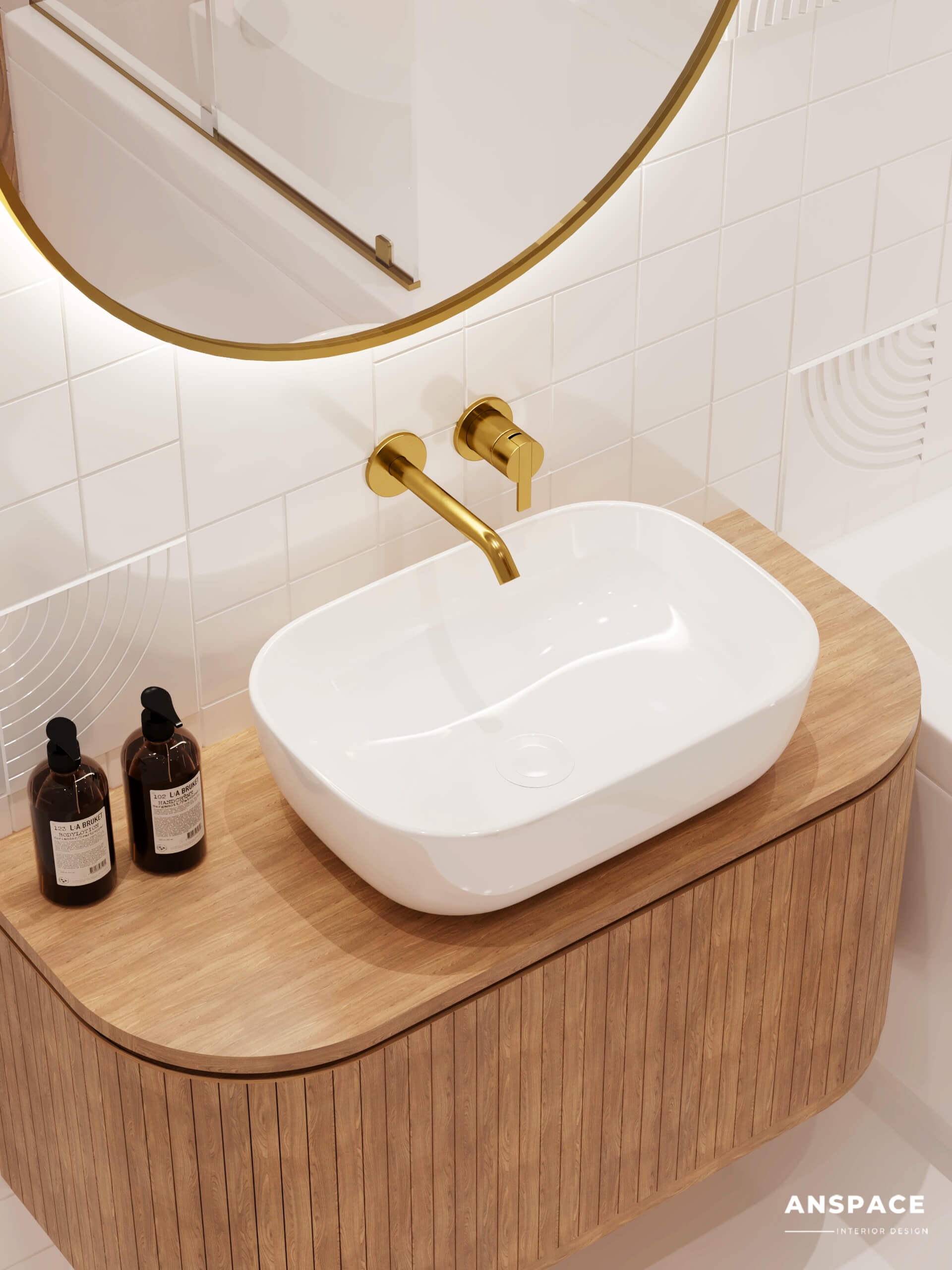 Całość dopełniają stylowe złote dodatki – od eleganckich baterii po inne subtelne elementy wyposażenia. Te detale podnoszą estetykę przestrzeni, wprowadzając odrobinę luksusu do codziennego użytku.