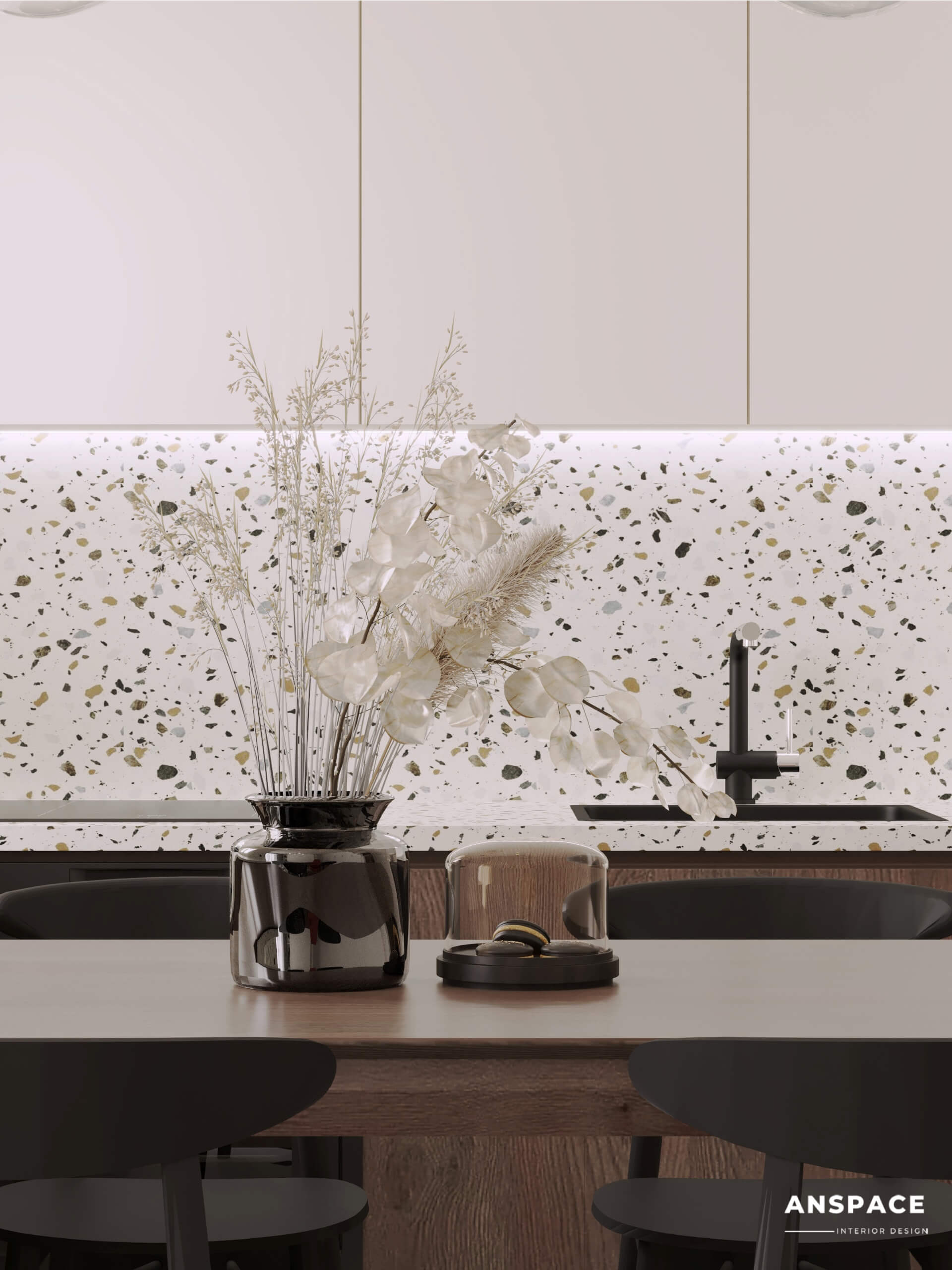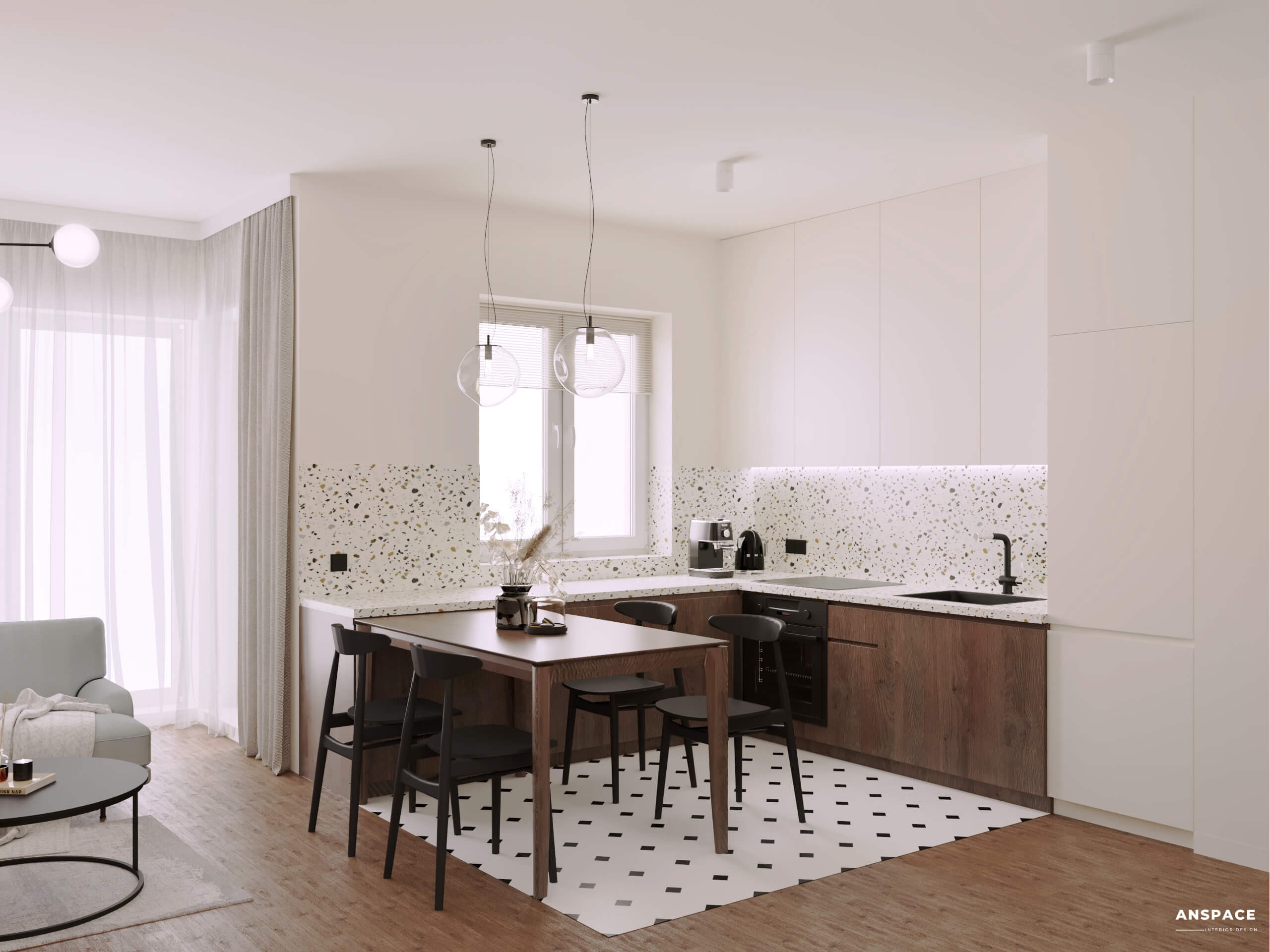 • Kuchnia w stylu minimalistycznym łączy prostotę form z industrialnymi akcentami, a lastryko na blacie kuchennym i ścianie wprowadza nowoczesny charakter.