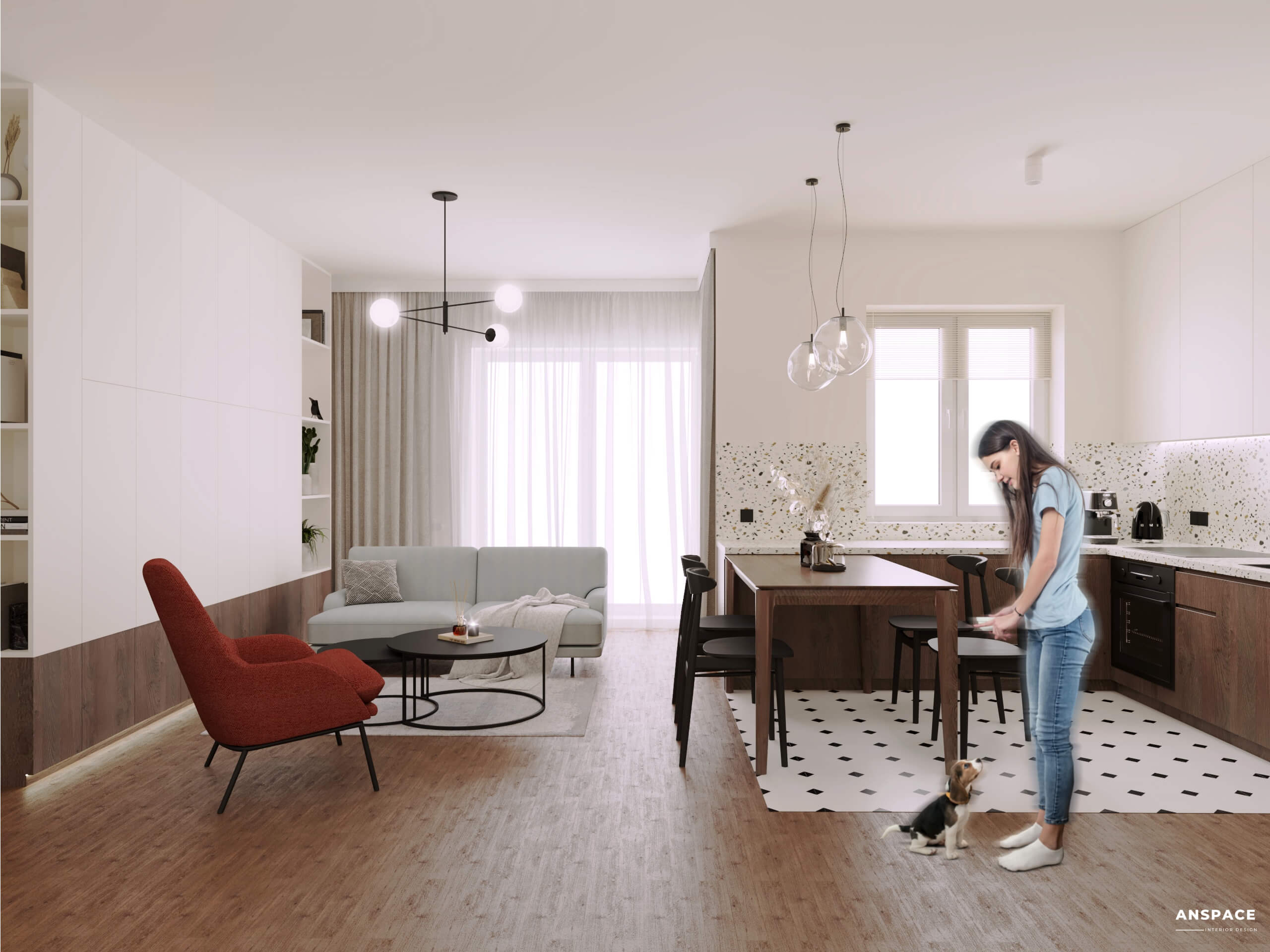 To projekt, który łączy styl nowoczesny i skandynawski z funkcjonalnością, tworząc idealną przestrzeń do życia w małym mieszkaniu.