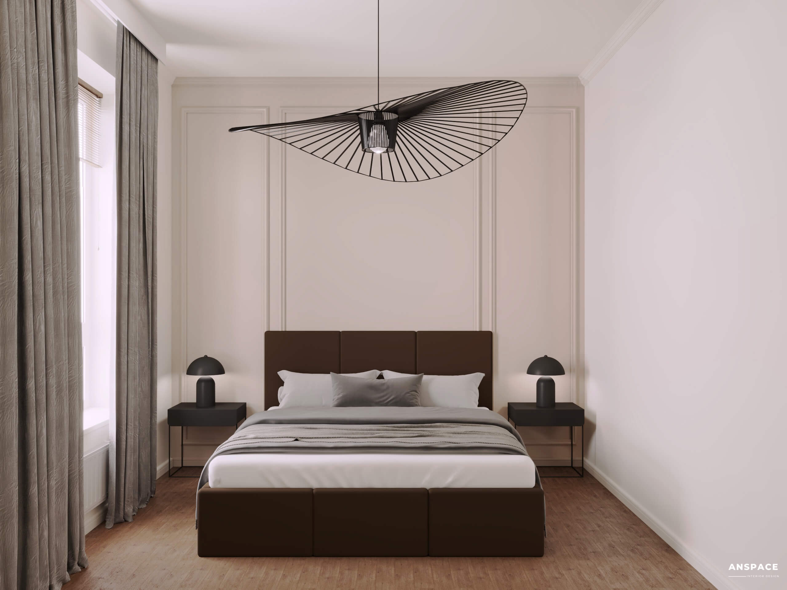 • Czarne lampy nocne oraz wisząca lampa w kształcie kapelusza to detale, które dodają wnętrzu wyjątkowego stylu.