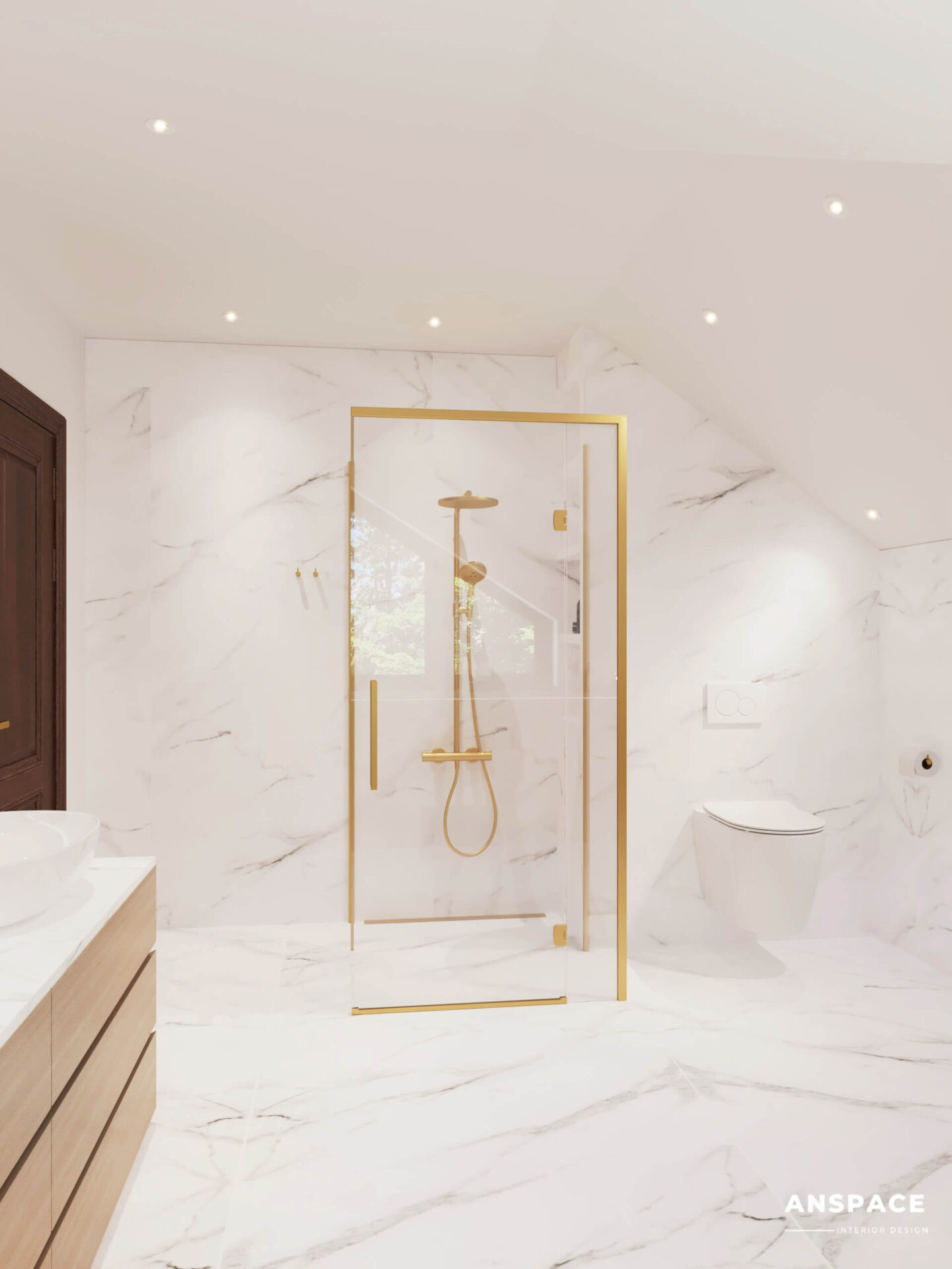 Wizualizacja łazienki z prysznicem ukazuje połączenie elegancji i funkcjonalności – złota armatura podkreśla luksusowy charakter wnętrza, a drewniane akcenty oraz subtelne oświetlenie tworzą przytulną, relaksującą atmosferę.
