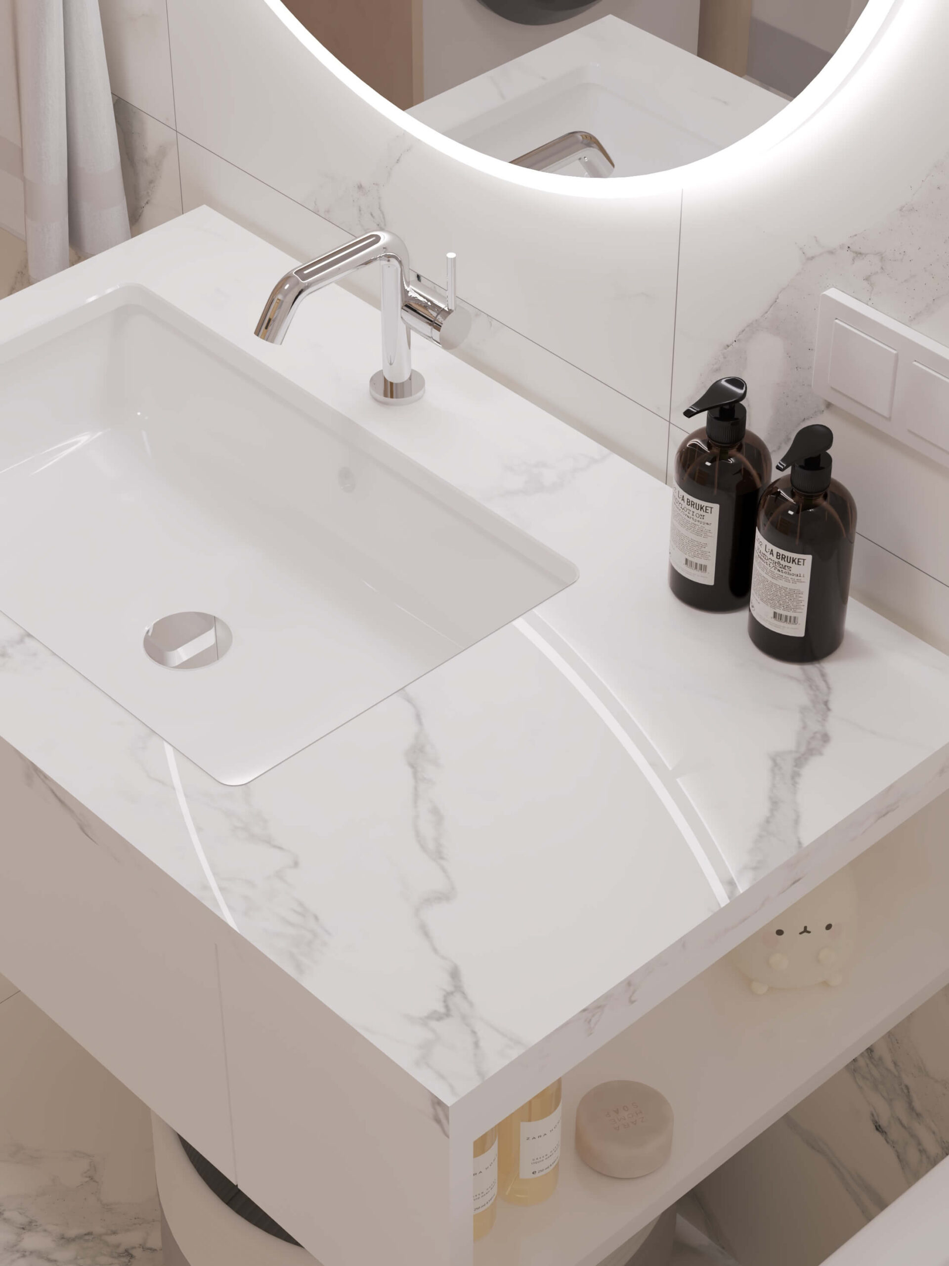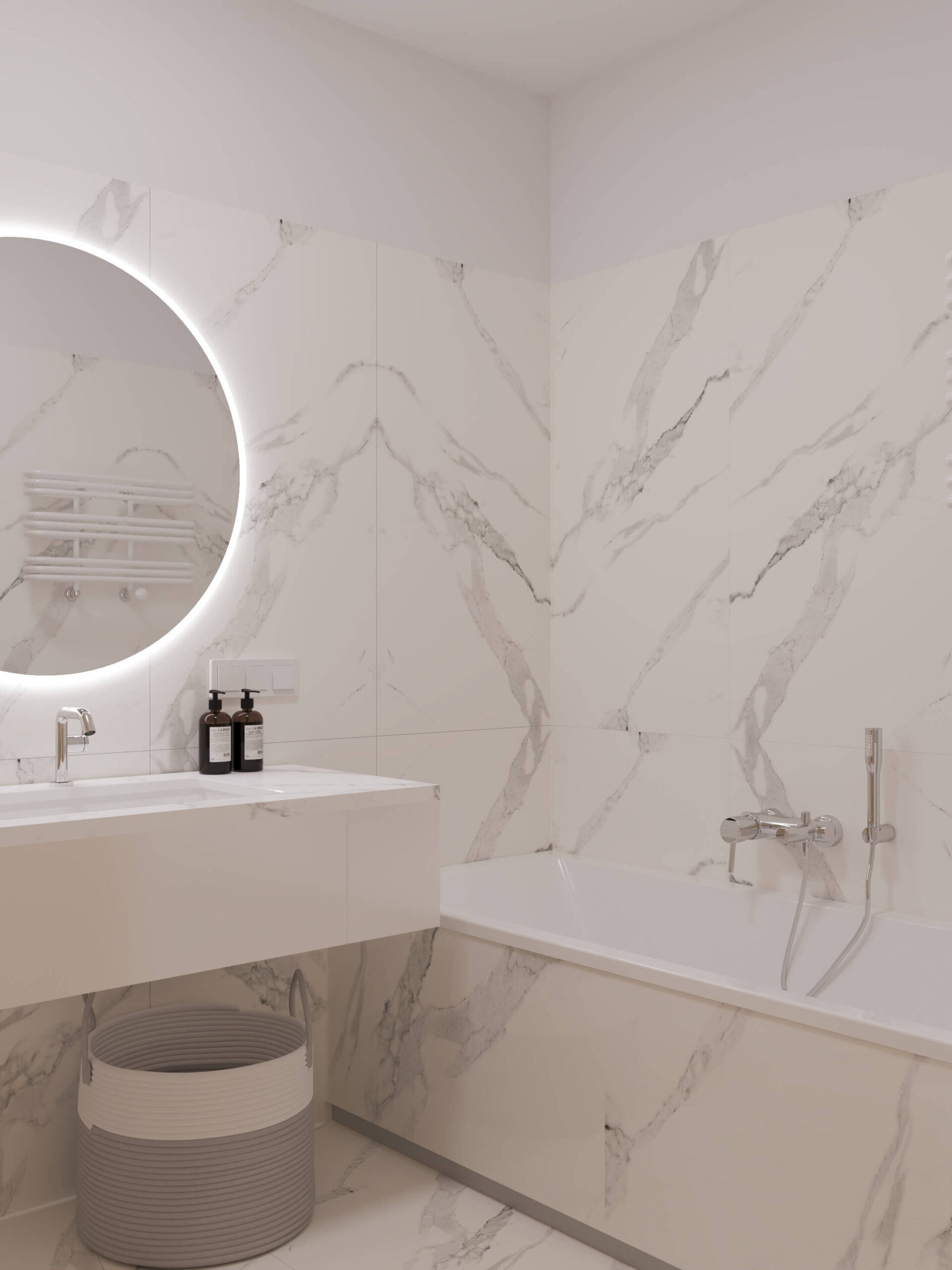 Projekt aranżacji bazuje na stylu nowoczesnym, w którym estetyka idzie w parze z funkcjonalnością. Klientce zależało na łatwym utrzymaniu łazienki w czystości, dlatego zastosowano gładkie powierzchnie odporne na zabrudzenia. W łazience przewidziano pojemne szafki do przechowywania, ergonomicznie rozmieszczone elementy sanitarne oraz sprytne rozwiązania, takie jak ukryte schowki czy podwieszane meble. To wszystko sprawia, że łazienka może być zarówno komfortowa, jak i stylowa.