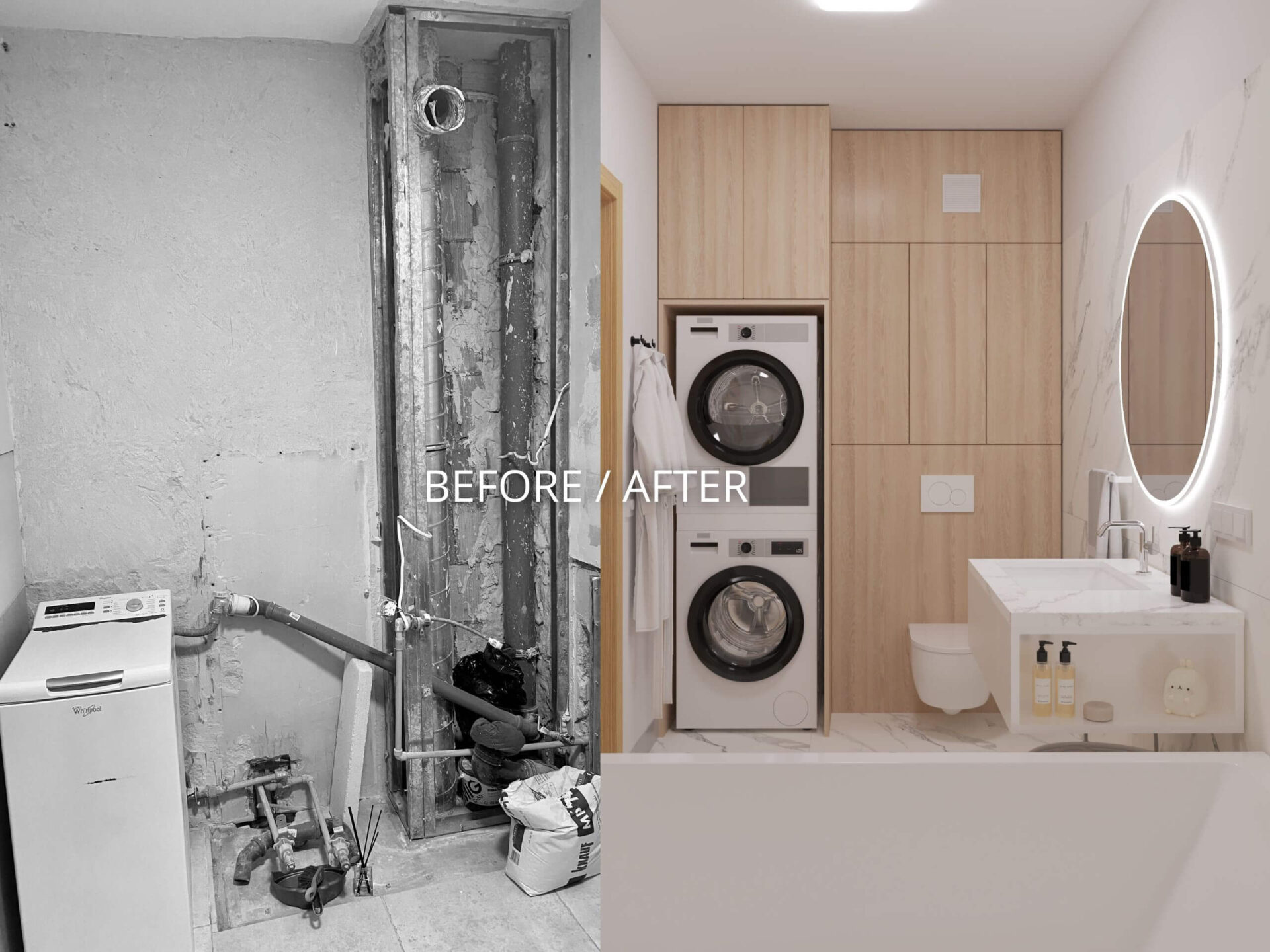 Jednym z kluczowych elementów aranżacji jest zabudowa, która pozwala na ukrycie pralki i suszarki, zapewniając estetyczny wygląd oraz dodatkowe miejsce do przechowywania. Dzięki temu przestrzeń pozostaje uporządkowana, a każdy element ma swoje funkcjonalne miejsce.