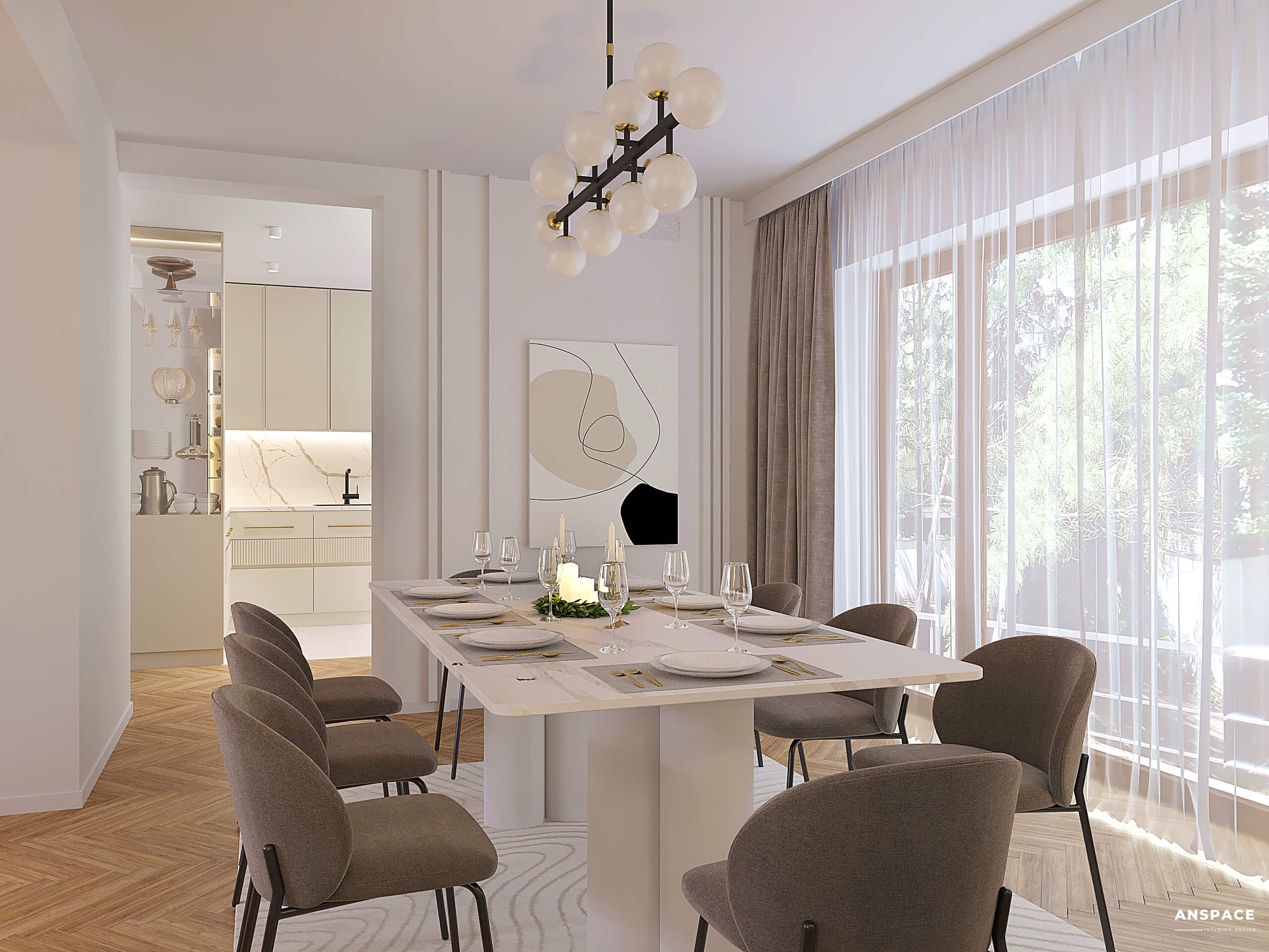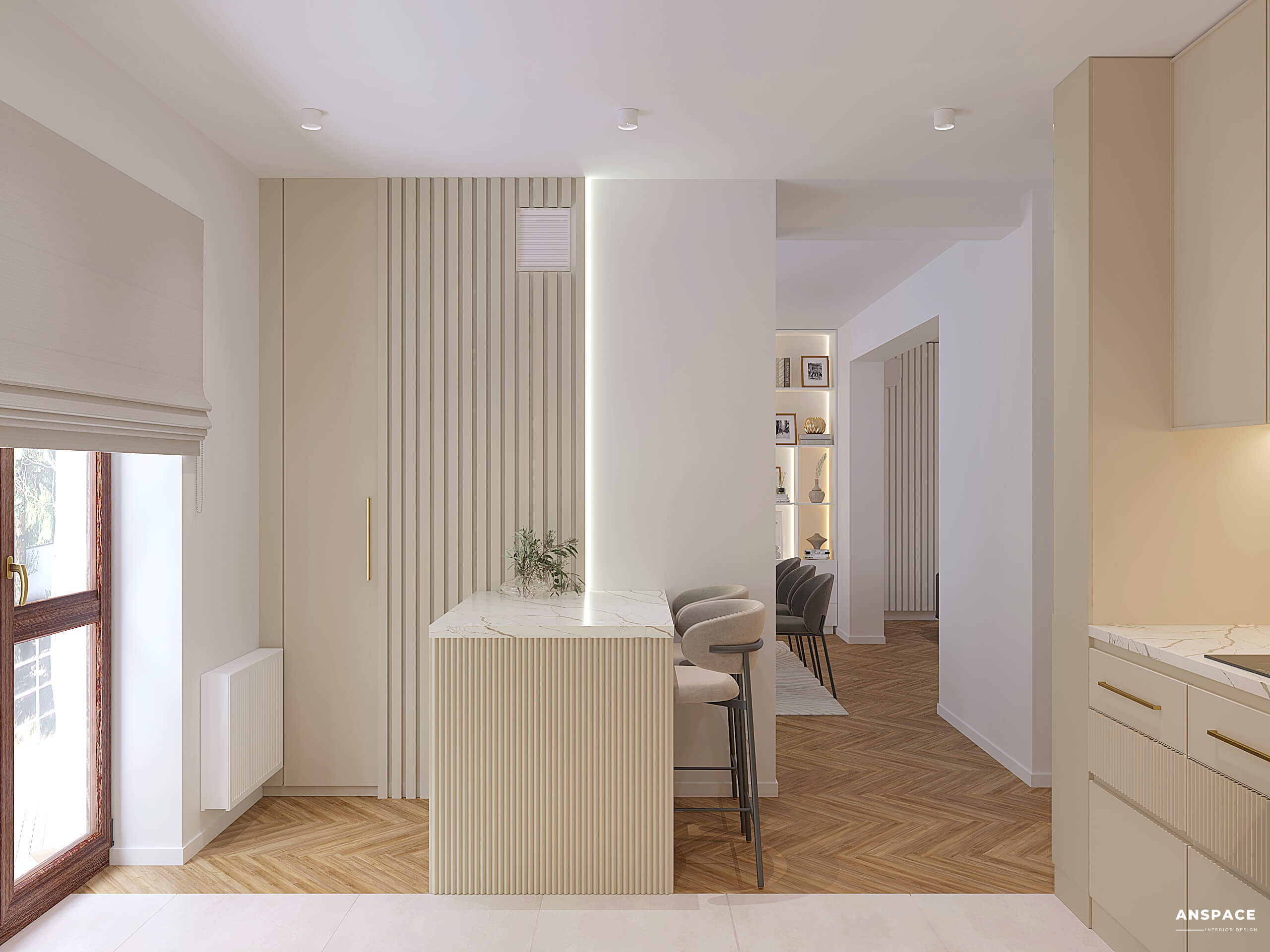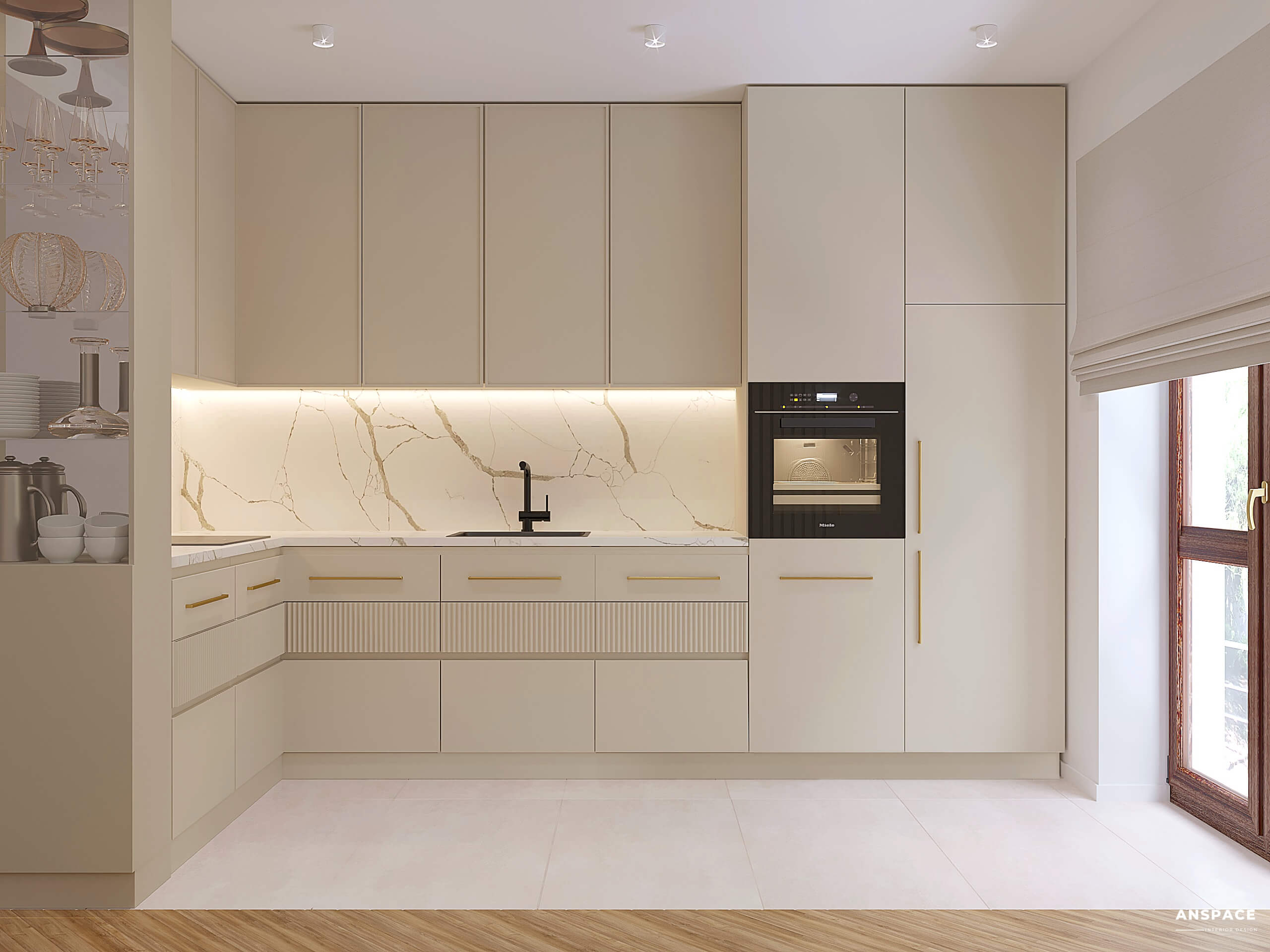 Beżowa kuchnia w nowoczesnym stylu to serce domu. Subtelne, jasne odcienie w połączeniu ze złotymi akcentami nadają wnętrzu luksusowego charakteru, jednocześnie zachowując jego ciepło.